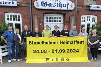 Erfde. Vom 24. August bis 01. September 2024 feiert die Gemeinde Erfde das traditionelle Stapelholmer Heimat- Sänger- und Trachtenfest. Unter dem Motto „100 Jahre Heimatfest“ werden alle Dörfer in Stapelholm und die Stadt Friedrichstadt mit einem Wettbewerb für das Fest werben. Während einer Versammlung des Stapelholmer Heimatbundes mit Vertretern der Gemeinden der Landschaft, wurden in Rahn’s Gasthof in Erfde die Bedingungen des Wettbewerbs und gelbe Banner, die auf das Fest aufmerksam machen sollen, verteilt. An prominenter Stelle im Ort sollen die Banner aufgehängt und dem Motto nach dekoriert werden. Beginnend ab dem 1. Juli wird damit an neun Orten zwischen Friedrichstadt und Wohlde Werbung für das Fest gemacht. Eine Jury wird die drei besten Einfälle prämieren. Es wird drei Preise geben. Die Siegergemeinden werden am letzten Sonntag des Festes ihre Preis erhalten.
