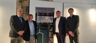 Prof. Vöpel zusammen mit den Bürgermeistern Thomas Klömmer (Erfde) und Tobias Tietgen (Friedrichstadt) sowie Peter Bernhardt (v.r.n.l.)