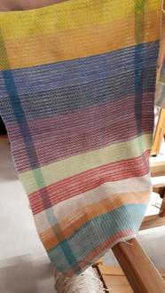 Aus den Kursen der Webmeisterin Imke Henze hat sich eine Gruppe interessierter Frauen gefunden, die mehr wollen. Angefangene Stücke weiter weben, neue Tücher planen und vorbereiten, einen Jackenstoff weben, es gibt unzählige Muster, Bindungen, Materialien, Farbzusammenstellungen. Zurzeit weben wir wieder das Waffelmuster für Handtücher, den Spitzköper für eine Stola, ein interessantes Panamamuster, eine Weberin webt fleißig Wollteppiche und Läufer, auch mal Flickenteppiche. Aus dem großen Vorrat an Synthetik-Wolle, alles Spenden, haben wir Luftmaschenketten gehäkelt, ein Gemeinschaftsprojekt für einen Wollteppich, schön bunt!
