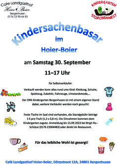 Die DRK-Kindertagesstätte „Storchennest“ und der Landgasthof Hoier-Boier in Bergenhusen veranstalten am Samstag, den 30. September einen gemeinsamen Kindersachenbasar. Von 11:00 bis 17:00 Uhr kann im großen Saal nach Herzenslust gestöbert werden!
