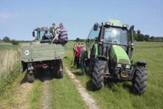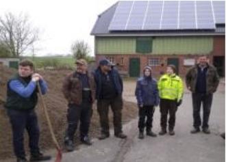 Hierfür werden Schlepper mit Anhänger benötigt und eine Vielzahl von Helfern, die mit Schaufeln dafür sorgen, dass das Material in die Löcher verteilt wird.