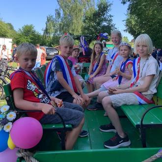 Der Umzug führte mit Trecker-Kutsche und Spielmannszug durch das Dorf. Nach dem Umzug amüsierten sich die kleinen und großen Kinder beim Kinder- und Luftballontanz und Tauziehen.