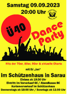Sarau. Am Samstag den 09.09.2023 um 20:00 Uhr veranstaltet der Schützenbund Glasau-Sarau eine „Ü40 Dance Party“ im Schützenhaus, Dorfstraße, in Sarau. Für gute Stimmung sorgt „DJ Jan“ mit Musik aus den 70er, 80er, 90er und aktuellen Charts. Einlass ist ab 19:30 Uhr für alle ab 40 Jahre die gern mal wieder das Tanzbein schwingen und feiern möchten. Karten gibt es bereits schon jetzt im Vorverkauf im Schützenhaus jeweils Donnerstag ab 18:00 Uhr und Sonntag ab 11:00 Uhr Tel.: 04525 1314 oder bei Ute Domnick Tel.: 04555 719667 sowie auch an der Abendkasse.