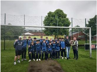 Trainer Jan Bern (v. re.), Finn Risch (Inhaber der Firma Risch Elektrotechnik), die C1-Jugendfußballmannschaft des SC Rönnau 74, Tobias Schütt (Trainer)