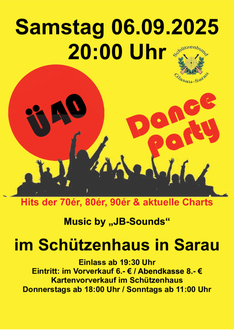 Sarau: Es ist wieder so weit, am Samstag den 06.09.2025 um 20:00 Uhr findet wieder eine „Ü40 Dance Party“ im Schützenhaus, Mühlenberg 1a, in Sarau statt. Für gute Stimmung sorgt wieder „DJ Jan“ mit Musik aus den 70er, 80er, 90er und aktuellen Charts. Einlass ist ab 19:30 Uhr für alle ab 40 Jahre die gern mal wieder das Tanzbein schwingen und Party machen möchten. Karten sind schon jetzt im Vorverkauf im Schützenhaus jeweils Donnerstag ab 18:00 Uhr und Sonntag ab 11:00 Uhr (Telefon 04525/1314) und bei Ute Domnick (Telefon 04555/719667) sowie an der Abendkasse erhältlich.