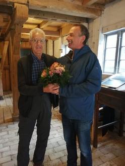 Im Namen der Rönnauer Mühlenmänner bedankte sich Georg Possekel, Sprecher der Mühlenmänner, bei Fred Sonnenstuhl mit einem Blumenstrauß für seine langjährige Unterstützung unserer Interessengemeinschaft als Mitglied des Gemeinderates Klein Rönnau.