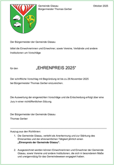Der Bürgermeister der Gemeinde Glasau bittet die Einwohnerinnen und Einwohner, sowie Vereine, Verbände und andere Institutionen um Vorschläge für den