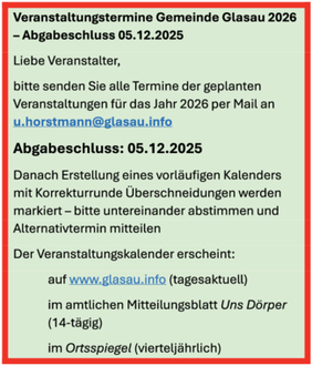 bitte senden Sie alle Termine der geplanten Veranstaltungen für das Jahr 2026 per Mail an u.horstmann@glasau.info