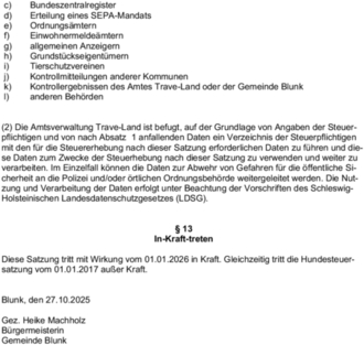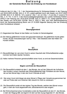 Aufgrund des § 4 Abs. 1 S. 1 der Gemeindeordnung für Schleswig-Holstein in der Fassung vom 28.02.2003 (GVOBl. Schl.-H. S. 57), zuletzt geändert durch das Gesetz vom 25.07.2025 (GVOBl. Schl.-H. S. 2025 Nr. 121), sowie § 1 Abs. 1, § 2, § 3 Abs. 1, 6 und Abs. 8 sowie § 18 Abs. 2, S.1 Nr. 2 und S. 2 des Kommunalabgabengesetzes des Landes Schleswig-Holstein (KAG) in der Fassung vom 18.03.2018 (GVOBl. Schl.-H. 2005 S. 27), zuletzt geändert durch das Gesetz vom 04.05.2022 (GVOBl. Schl.-H. 2022 S. 564), wird nach Beschlussfassung durch die Gemeindevertretung Blunk vom 27.10.2025 folgende Satzung über die Erhebung einer Hundesteuer erlassen:
