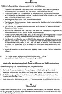 | 8. | Hunden, die zum Schutze und zur Hilfe blinder, tauber oder hilfloser Personen unent-behrlich sind. Hilflose Personen sind solche Personen, die einen Schwerbehinderten-ausweis mit den Merkmalen „B“, „Bl“, „aG“, „Gl“ oder „H“ besitzen. Die Steuerbefrei-ung kann von der Vorlage eines amtsärztlichen Zeugnisses abhängig gemacht wer-den. |