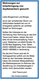 Sollten Sie Interesse an der Vermietung Ihrer Wohnung an das Amt Trave-Land haben, setzen Sie sich bitte mit der Amtsverwaltung Trave- Land, Waldemar-von-Mohl-Straße 10, 23795 Bad Segeberg, Frau Tabari (04551-990839) oder Herrn Kietzmann (04551-990868) in Verbindung.
