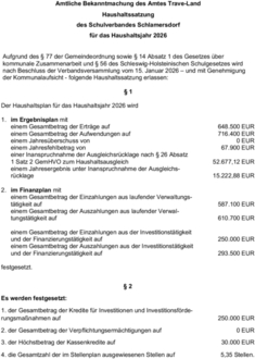 Aufgrund des § 77 der Gemeindeordnung sowie § 14 Absatz 1 des Gesetzes über kommunale Zusammenarbeit und § 56 des Schleswig-Holsteinischen Schulgesetzes wird nach Beschluss der Verbandsversammlung vom 15. Januar 2026 – und mit Genehmigung der Kommunalaufsicht - folgende Haushaltssatzung erlassen: