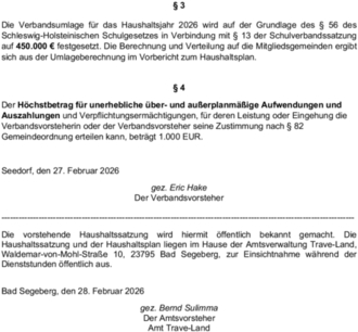 Die vorstehende Haushaltssatzung wird hiermit öffentlich bekannt gemacht. Die Haushaltssatzung und der Haushaltsplan liegen im Hause der Amtsverwaltung Trave-Land, Waldemar-von-Mohl-Straße 10, 23795 Bad Segeberg, zur Einsichtnahme während der Dienststunden öffentlich aus.