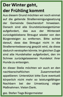 Danach sind alle Grundstückseigentümer aufgefordert, das aus der Winterzeit zurückgebliebene Streugut wieder von den Bürgersteigen zu entfernen. Bitte achtet darauf, dass das Streugut nicht in die Straßenentwässerung gespült wird, da diese dadurch verstopfen könnte. Im gleichen Zuge sind alle Hundehalter aufgefordert, den im Schnee zurückgelassenen Hundekot ihrer Hunde zu entsorgen.