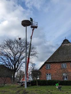 Der Storchenmast hatte viele große Risse. Deshalb wurde am 22.3.23 der Mast des Storchennestes gereinigt und restauriert.