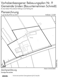 Die Gemeindevertretung der Gemeinde Linden hat in ihrer Sitzung am 20.03.2025 beschlossen, für das Gebiet „Grundstück Holtweg 3 und Holtweg 3 a“ den vorhabenbezogenen Bebauungsplan Nr. 9 aufzustellen. Planungsziel ist die Ausweisung eines Sondergebietes zur Umsiedlung eines ortsansässigen Bauunternehmens.