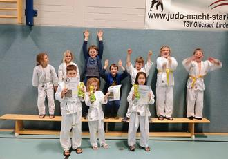Alle drei haben ihre Prüfung bestanden und tragen in Zukunft zu ihrem Judoanzug den gelb/weißen Gürtel. Mit Aushändigung der Urkunden und Judopässen gab es noch einen Schoko-Osterhasen als Belohnung.