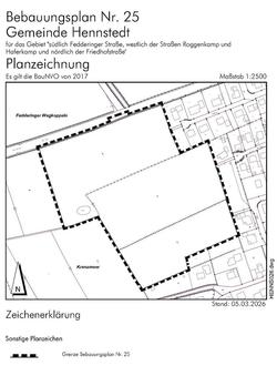 Die Gemeindevertretung der Gemeinde Hennstedt hat in ihrer Sitzung am 25.02.2026 beschlossen, für das Gebiet "südlich Fedderinger Straße, westlich der Straßen Roggenkamp und Haferkamp und nördlich der Friedhofstraße“ den Bebauungsplan Nr. 25 aufzustellen. Planungsziel ist die Herstellung der bauplanungsrechtlichen Voraussetzungen zur Ausweisung eines Wohnbaugebietes.