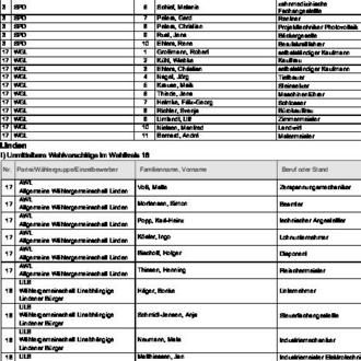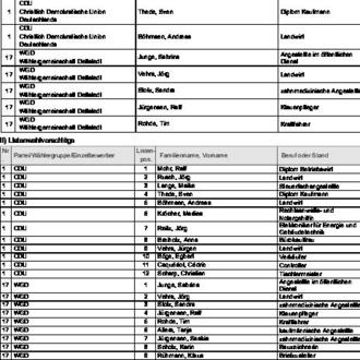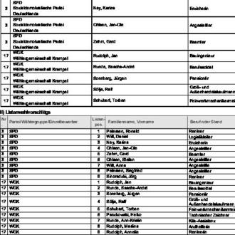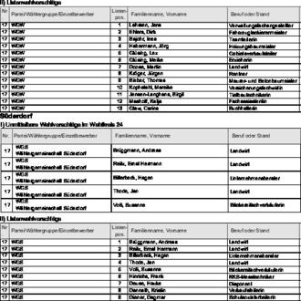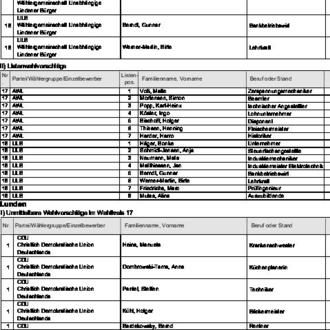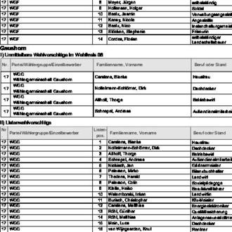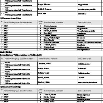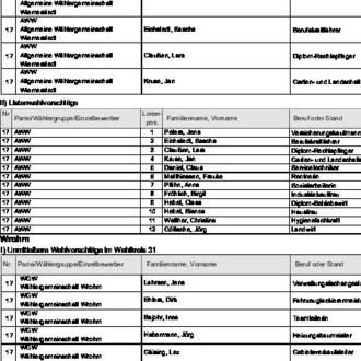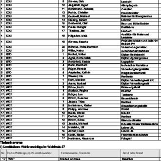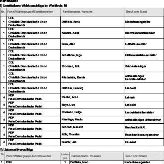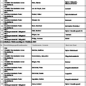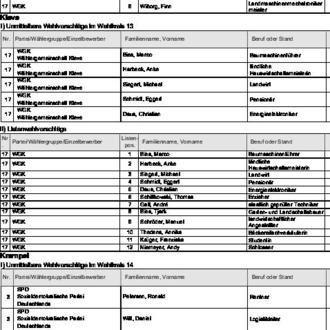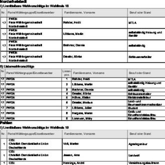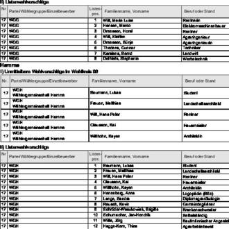 zugelassen. Diese Wahlvorschläge werden hiermit bekannt gemacht (§ 25 Abs. 4 des Gemeinde- und Kreiswahlgesetzes (GKWG), §§ 31 Abs. 1, 87 der Gemeinde- und Kreiswahlordnung (GKWO)).
