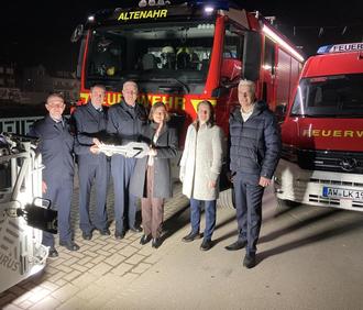 DERNAU.OC. Hohen Besuch konnte Frank Linnarz, Wehrleiter der Verbandsgemeinde Altenahr, bei der diesjährigen Dienstversammlung am Freitag, 3. März, im Gemeindehaus Dernau begrüßen. Staatssekretärin Nicole Steingaß, Landrätin Cornelia Weigand, Bürgermeister Dominik Gieler sowie Brand- und Katastrophenschutzinspekteur Michael Zimmermann gaben sich die Ehre. Zuvor hatte Steingaß ein Hilfeleistungs- und Löschfahrzeug HLF 20 und ein Drehleiterfahrzeug DL(A)K 23/12 im Wert von 1,12 Mio. Euro finanziert zu 100 Proznet aus der Fluthilfe übergeben. Die Beladung dieser Fahrzeuge in Höhe von rund 130.000 Euro wird voraussichtlich durch die Versicherung gedeckt. Eine „eierlegende Wollmilchsau“ hatten - nach Aussage von Linnarz - Weigand, Zimmermann und der Kreistag in Form eines weiteren Fahrzeugs beschafft, welches sowohl als Mannschaftstransportwagen als auch Reservefahrzeug für den ABC-Erkunderkraftwagen genutzt werden kann. Hier betrug das Investitionsvolumen rund 95.000 Euro. Marktüblich für diese Fahrzeuge sind Beschaffungszeiten von bis zu drei Jahren - durch das perfekte Zusammenspiel aller am Ersatzbeschaffungsprozess Beteiligten können in diesem Fall die Fahrzeuge bereits nach zwölf Monaten in Dienst gestellt und dadurch die Einsatzbereitschaft der Feuerwehren der VG Altenahr fahrzeugtechnisch weitestgehend wiederhergestellt werden.