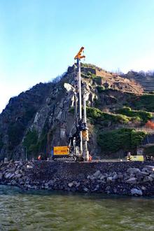 WALPORZHEIM. (ang) Personen, die an der „Bunten Kuh“ entlangkommen, sehen, dass der Aufbau der Ahrtalbahn und des Radweges in vollem Gange ist. Dabei werden auch besondere Baumaschinen eingesetzt. Eine davon ist das „Bohrgerät 33 H“ eines renommierten Maschinenbauers aus dem bayrischen Schrobenhausen. Sie wird im Spezialtiefbau eingesetzt und ist essentiell bei der Wiederherstellung von den rund 90 Meter der insgesamt 260 Meter langen Stützwand an der B 267 bei Walporzheim (Bunte Kuh). Die Arbeit des „Kolosses“ vor der malerischen Kulisse des Naturdenkmals ist sehr bemerkenswert. Die Autofahrer indes werden sich weniger an dieser Kulisse nebst Baumaschine erfreuen, bedeutet die Baustelle für sie doch Einschränkungen, denn die Fahrbahn ist nur einseitig befahrbar und wird mit einer Ampel geregelt.
