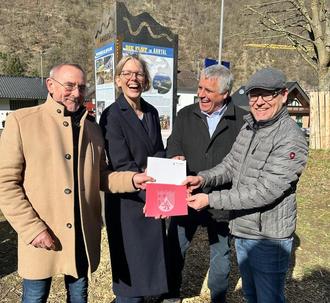 AHRBRÜCK. Die Staatssekretärin Simone Schneider überrascht im Anschluss an die feierliche Einweihung der Flut-Gedenkstele (s. Presseberichte) am Samstag, 28.02.2026, die Gemeinde Ahrbrück und den Sportverein ABK 54 Ahrbrück e. V. - im Gepäck hatte Frau Schneider im Namen des Innenministers Michael Ebling den genehmigten Förderbescheid für den Bau der Sportanlage in Ahrbrück in Höhe von über 1,1 Millionen Euro. Die geglückte Überraschung und die Freude über den Bescheid waren Bürgermeister Guido Galle, dem Vorsitzenden des ABK und 1. Beigeordneten Franz-Josef Christ und dem Geschäftsführer des ABK Andreas Hupperich bei der Übergabe im Gesicht abzulesen.