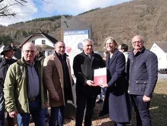 Ahrbrück im Wandel. Diese Konsequenz aus der Flutkatastrophe dokumentiert die neunte Stele des Projekts MemoriAHR, die nun am Bürgerhaus Ahrbrück steht. Mit der Einweihung gab es auch einen Förderbescheid für die neue Sportanlage mit Kunstrasen und Laufbahn.