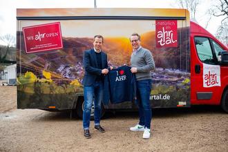 MAX HARRUS - David Bongart vom Ahrtal-Tourismus (r.) dankte Olaf Ley von Unibail-Rodamco-Westfield vor Ort im Ahrtal für die Unterstützung der We AHR open-Kampagne.