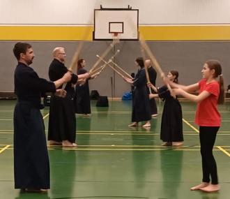 Mit neuen Bambusschwertern bei Grundübungen