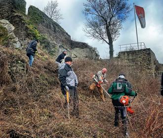 RECH. Am Samstag, 24. Februar, versammelten sich 16 Recher Mitbürger:innen, um gemeinsam gegen den Wildwuchs an verschiedenen Stellen im Ort vorzugehen. Hauptsächlich konzentrierte sich die Aktion auf den Teil der Ruine Saffenburg, der auf Rech zuführt, sowie das Grundstück um das Weindorf Rech Schild.
