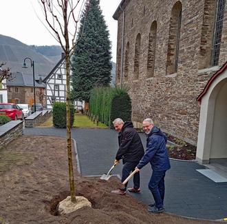 „Wir wollen mit dieser Geste unsere enge Verbundenheit zur Pfarrgemeinde unterstreichen und zugleich einen nachhaltigen Beitrag für unser Ortsbild leisten“, erklärt Benno Kastenholz von der Kolpingsfamilie. Gemeinsam mit Edgar Bertram, Vertreter der Kirchengemeinde, wurde der Baum feierlich gepflanzt.