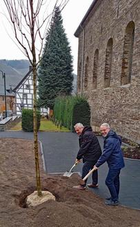 Die Kolpingfamilie Dernau feiert in diesem Jahr nicht nur ihr 60-jähriges Jubiläum, sondern setzt auch ein „grünes Zeichen“ für die Gemeinschaft: Benno Kastenholz und Edgar Bertram (v.r.) halfen tatkräftig bei der Pflanzung des gespendeten Rot-Ahorn .