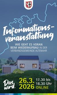 VG Altenahr. Am Donnerstag, 26.03.2026, lädt die Verbandsgemeinde Altenahr alle Interessierten ab 17:30 Uhr zu einer Informationsveranstaltung über verschiedene Wiederaufbaumaßnahmen in der Verbandsgemeinde ein. Welche Maßnahmen derzeit in Bearbeitung sind, welche Projekte im Laufe des Jahres 2026 voraussichtlich fertiggestellt werden und welche Vorhaben bereits abgeschlossen sind, stehen im Mittelpunkt. Die Teilnehmenden können sich über den Stand der Arbeiten informieren und mit Fachleuten von der Verbandsgemeinde und den Projektsteuerern in den Austausch treten. Die Veranstaltung wird online mit dem Videokonferenz-Tool WebEx organisiert.
