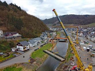Ein Provisorium hat ausgedient: Am Montag, 31. März, ist die Behelfsbrücke in Dernau ausgehoben worden. Ein Spezialkran einer Firma aus dem Ahrtal hat die Brücke "an die Seite" gehoben.