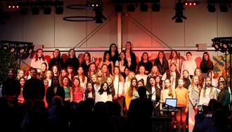 Begeisternd und mitreißend – alle 65 Sänger*innen der Vocal Night auf der Bühne der Mensa des Are-Gymnasiums.