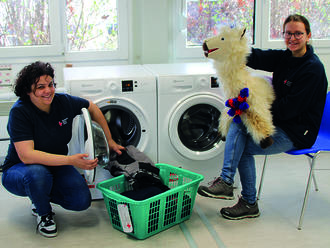 Einer der ersten Besucher in unserem neu ausgestatteten Waschsalon bei Sana Daghfous-Soussi (li.) und Eva Grüber (re.) war das Alpaka „Indigo“ – die Sympathiefigur des DRK-Resilienz-Projekts.