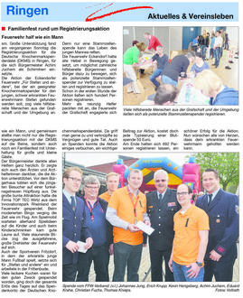 Seine Freunde sowie Kameraden und Kameradinnen der Freiwilligen Feuerwehr suchten einen Weg, ihn in dieser schwierigen Situation zu unterstützen und organisierten deshalb im April 2013 eine Typisierungsaktion in Grafschaft-Ringen unter dem Motto „Gemeinsam für Stefan und andere“. Die Grafschafter Zeitung (18/2013), herausgegeben vom LINUS WITTICH Verlag, berichtete damals darüber. Durch den Einsatz von vielen helfenden Händen war die Typisierung ein voller Erfolg: Rund 700 neue potenzielle Spender wurden in die Datei bei der DKMS (Deutsche Knochenmarkspenderdatei) aufgenommen. Stefan M. zur damaligen Aktion: „Die riesige Bereitschaft zu helfen war größer als es das Wort Danke“ jemals ausdrücken kann. Es war für mich und meine Familie kaum in Worte zu fassen. Leider war es mir aus gesundheitlichen Gründen nicht möglich an der Aktion teilzunehmen. Das Risiko einer Infektion war viel zu hoch.“