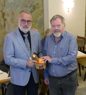 FK a. D. Ulf Neelsen (r.) dankte GenOStArzt a. D. Baumgärtner für seinen Vortrag und nahm, natürlich gegen eine Spende, ein Stoffpatentier der Härtefallstiftung entgegen.