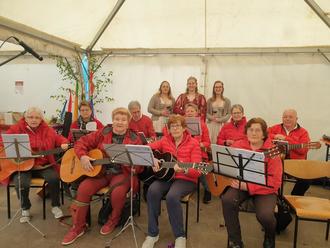 DERNAU. Die Gitarrengruppe Dernau spielt seit dem Jahr 2010, dem Start des 1. Dernauer Weinfrühling, zur Eröffnung für die Gäste die schönsten Maien- und Wanderlieder. Die Lieder fanden über zwei Stunden großen Anklang und viele Gäste sangen zum Auftakt der Wanderung begeistert mit. In diesem Jahr fand die Eröffnung auf dem noch nicht wieder aufgebauten Weinbrunnenplatz statt. Die Vorstandsmitglieder des Verkehrsvereins hatten es sich nicht nehmen lassen mit viel Aufwand und Phantasie den Platz für Gäste und Dernauer mit Pagodenzelten, Sitzgelegenheiten und vielen bunten Maihecken so herzurichten, dass für alle Wanderer der Wein- und Infostand des Verkehrsvereins wie in den Jahren vor der Flut als tradioneller Treff- und Startpunkt für die Wanderung genutzt wurde. Im Namen des Verkehrsverein WeinKulturDorf Dernau begrüßte die stellvertretende Vorsitzende Elke Surges die Mitglieder der Gitarrengruppe und bedankte sich für ihren langjährigen ehrenamtlichen Einsatz. Die Weinkönigin Ronja mit ihren Prinzessinnen Laura und Nadja begrüßten die vielen Wanderer bei der Eröffnung und bedankten sich ebenfalls bei der Gitarrengruppe.