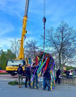 KALENBORN.OC. Aufgrund der günstigen Terminlage der Mainacht ging das traditionelle Kalenborner Maibaum-Fest in diesem Jahr über zwei Tage: Am Samstag, den 29. April, fand um 18 Uhr die Eröffnung am Wendeplatz mit gemütlichem Dämmerschoppen statt. Bereits am Samstagabend begaben sich die JGV-Mitglieder auf ihre Tour durch Kalenborn, um traditionell den Kalenborner Mädchen, die älter als 16 Jahre sind, einen Maibaum zu stellen. In diesem Jahr hatten die fleißigen starken Männer besonders kräftige, gerade gewachsene Maien ausgesucht, auch mit dem Bänderschmuck hatten sie sich in diesem Jahr besondere Mühe gegeben. Am Sonntag, den 30. April, wurde die offizielle Mainacht um 18 Uhr am Wendeplatz eröffnet. Ab 19 Uhr konnten die Besucher dem Maibaumstellen des 20 m hohen Dorfmaibaums mit Hilfe eines 45 m Mobilkrans beiwohnen. Die kleinen Gäste konnten sich auf der angemieteten Hüpfburg ordentlich austoben und anschließend mit ihren Eltern bei Grillgut und hausgemachten Salaten stärken. Selbstverständlich durfte auch ein Nagelturnier nicht fehlen. Als gegen 21 Uhr der Dorfmaibaum ausgelost wurde, war der glückliche Gewinner nicht lange zu suchen: Martin Münster hatte das Gewinnerlos erworben und freute sich sichtlich über den begehrten Brennstoff. Am romantischen Lagerfeuer wurde der Mai traditionell begrüßt und besungen. Ein schöner Brauch, der auch weiterhin gepflegt werden sollte!