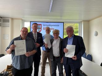 Über die neuerlichen Förderungen freuen sich (v.l.) Thomas Hostert (Rech), Minister Michael Ebling, VG-Bürgermeister Dominik Gieler, Bürgermeister Walter Radermacher (Ahrbrück) und Bürgermeister Fred Sebastian (Dernau).