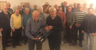 Vorsitzender Helmut Fischer überreicht dem ältesten, aktiven Sänger Robert Surges für seinen Einsatz ein Weinpräsent.
