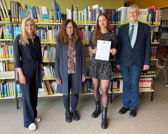 Eine Teilnahmeurkunde im Rahmen des Wettbewerbs erhielt Max Weidert als weiterer Oberstufenschüler des Philosophie Grundkurses aus der MSS 11. Schulleiterin und betreuende Lehrerin Dr. Annette Gies gratulierte der Gewinnerin und dem Teilnehmer sehr herzlich.