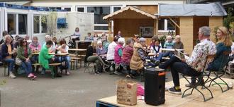 Im Freigelände des Kreuzberger Dorftreffs referierten Heike Boomgaarden und Werner Ollig.