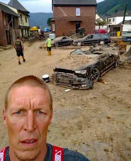 Im Juli 2021 in Dernau: Die Betroffenheit steht dem jetzt verstorbenen Ahrtalfluthelfer Frank Sendner ins Gesicht geschrieben.