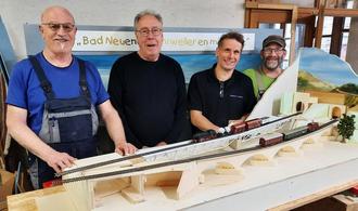 Der neue Vorstand vor dem neuen Brückenmodul, das die beiden, total zerstörten Eisenbahnbrücken zwischen Mayschoß und Rech darstellt: (v.l.) Hans-Jürgen Schick, Rudolph Brezina, Hardi Schüller, Frank Siebertz.