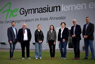 Die Flutkatastrophe im Juli 2021 hatte wesentliche Gebäudeteile des etablierten Are-Standortes in der Mittelstraße in Bad Neuenahr-Ahrweiler stark beschädigt oder zerstört. Rund vier Monate nach der Flutkatastrophe wurden daher in der Gemeinde Grafschaft fast 300 Container aufgestellt. Rund 820 Schülerinnen und Schüler des flutbeschädigten Are-Gymnasiums wurden fortan in vier großen Containerkomplexen unterrichtet. Insgesamt handelt es sich um 40 Klassenräume sowie drei Gebäude für eine Mensa, eine Sporthalle sowie ein noch im Bau befindlicher Komplex für Naturwissenschaften, der laut Schulleiterin Pfeil aufgrund steigender Schülerzahlen auch dringend benötigt werde. Landrätin Weigand hob den zielgerichteten Austausch hervor, bei dem eine mögliche Erweiterung aufgrund perspektivisch steigender Schülerzahl genauso thematisiert wurde wie flankierende Bildungsangebote oder Aspekte der Digitalisierung. „Hinsichtlich etwaiger Unterstützungsangebote stehen wir weiterhin im Austausch. Wir haben den Anspruch, gemeinsam mit den Verantwortlichen bestmöglich die Weichen für die Zukunft stellen“, sagte die Landrätin.