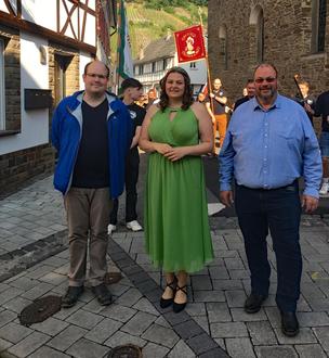 Unter „klingendem Spiel“ ging es über die Brücke, vorbei an der Recher Pfarrkirche zu dem kommenden Dorfplatz hinter der alten Schule des Weinortes. Auch dort applaudierten viele Recher Bürger und Freunde der neuen Regentin des Weinanbaugebietes Ahr.