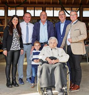 Hinten, v. l.: Enkelin Katkrin Hengsberg-Klein, Sohn Franz-Josef Hengsberg, Ortsbürgermeister Jürgen Schwarzmann, Erster Beigeordneter der Verbandsgemeinde Altenahr Georg Knieps, Erster Kreisbeigeordneter Horst Gies Vorn, v. l.: Urenkel Felix Hengsberg und die Jubilarin Maria Hengsberg