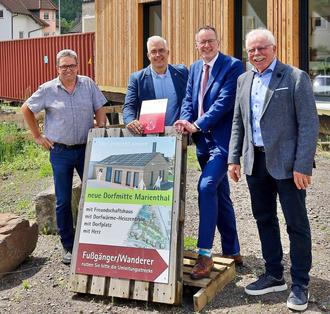 Rolf Schmitt, Bürgermeister Dominik Gieler (v. l.) und Ortsbürgermeister Alfred Sebastian (r.) freuen sich über einen Förderbescheid aus dem rheinland-pfälzischen Dorferneuerungsprogramm für die Neugestaltung der Ortsmitte Marienthal, den Innenminister Michael Ebling (2. v. r.) überreichte.